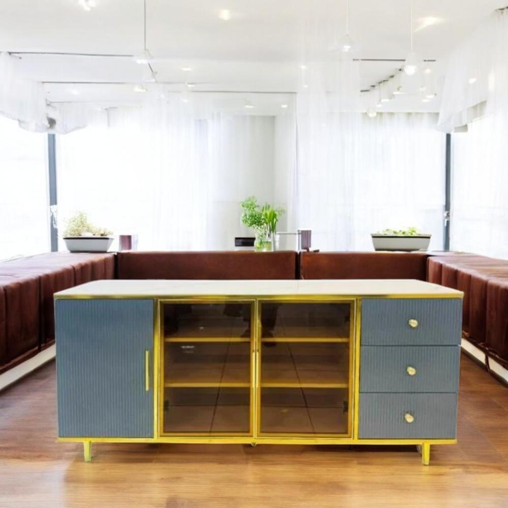 بابان أزرقان بأقمشة مموجة وأبواب زجاجية شفافة، مما يوفر مساحة واسعة لعرض مقتنياتك الثمينة أو تخزين أدواتك المنزلية بشكل منظم وجميل.