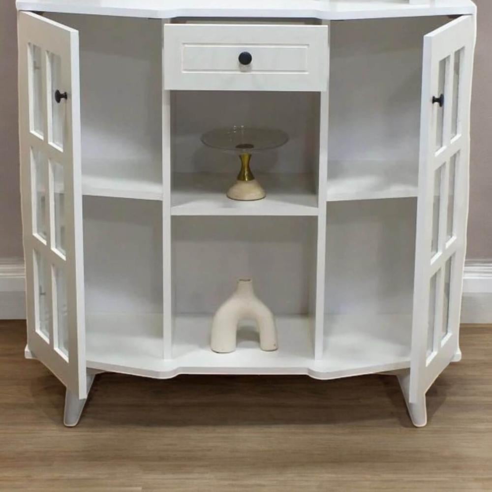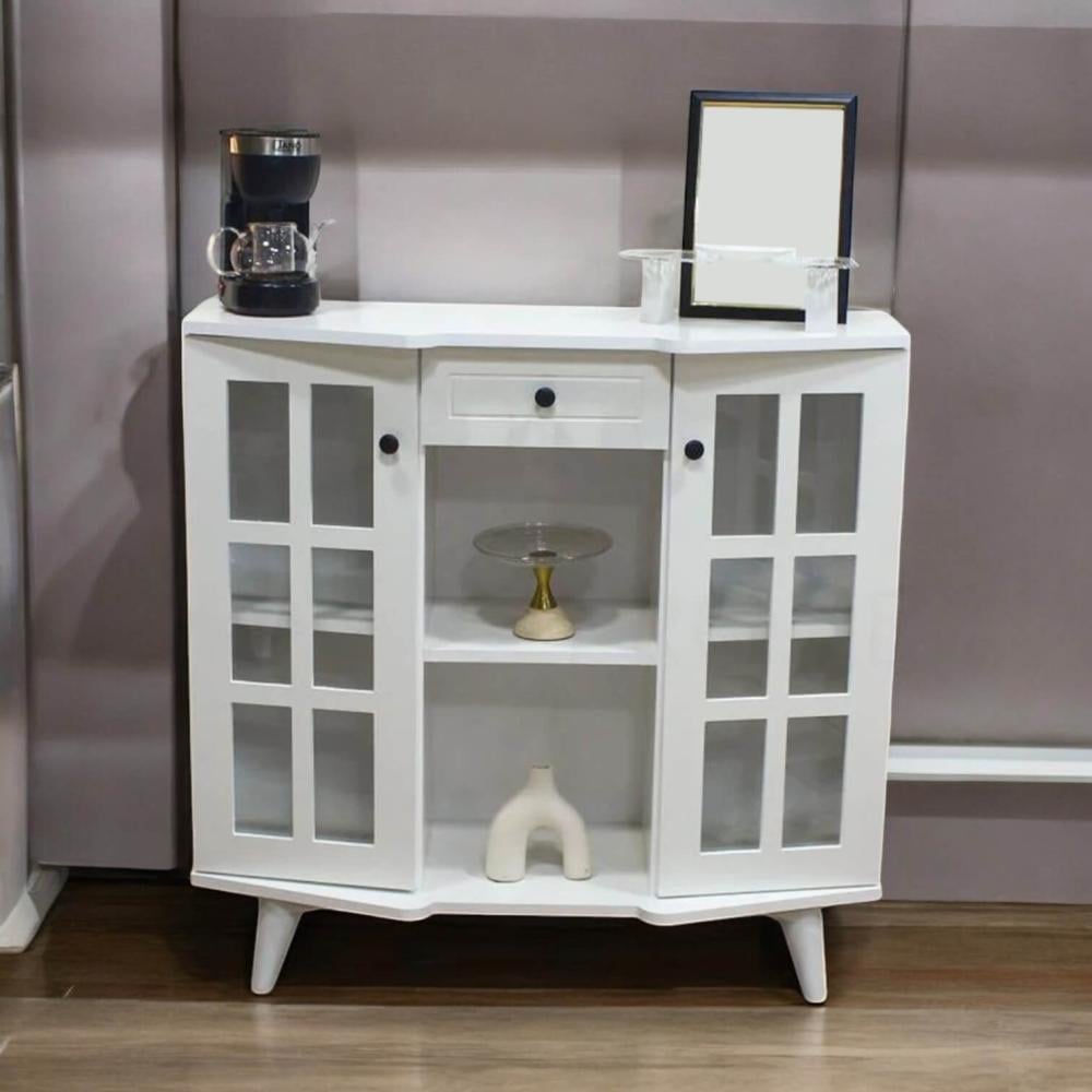 اجعل منزلك أكثر أناقة وتنظيمًا مع هذا البوفيه الأبيض العصري. يتميز بدرج علوي عملي في المنتصف لتخزين الأدوات صغيرة الحجم، ودرجين زجاجيين على الأطراف يعرضان مقتنياتك الثمينة بشكل أنيق. الرفوف الوسطية المفتوحة مثالية لتخزين الكتب أو عرض الديكورات.