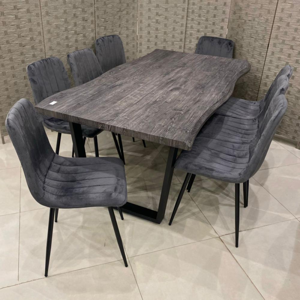 كراسي مخملية أنيقة: تتكامل الكراسي المنجدة بالمخمل الرمادي مع الطاولة، حيث توفر راحة وجمالاً. تتميز الكراسي بتصميم ظهرها المرتفع الذي يوفر الدعم للظهر.
