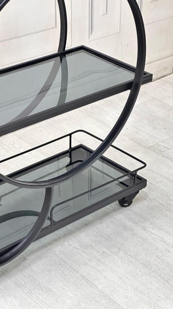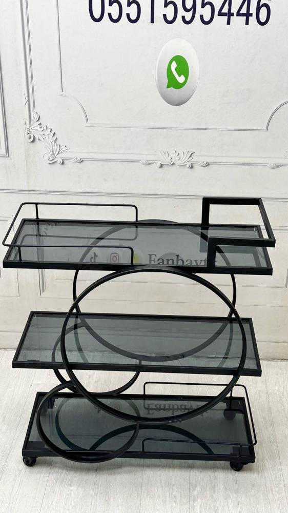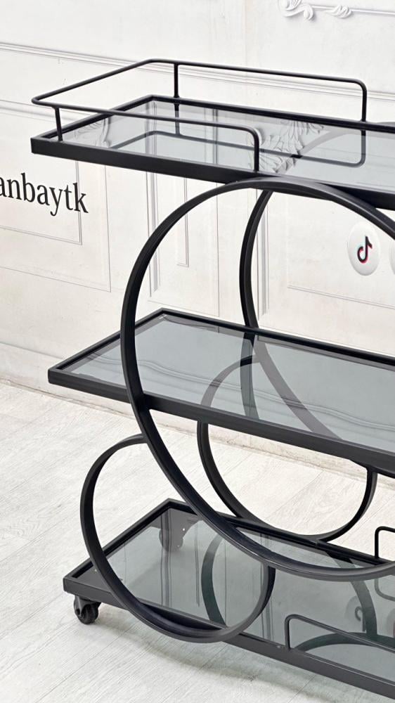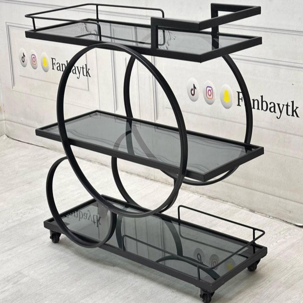 العربة مصممة بثلاثة أدوار، كل منها يتميز بسطح زجاجي أسود. ما يميز هذه العربة هو هيكلها الذي يعكس حركة تصميمية حديثة. يمكن أن يعني ذلك أن الإطار الأسود لا يتبع خطوطًا مستقيمة تقليدية، بل يشتمل على منحنيات جريئة، زوايا غير متوقعة، أو خطوط ديناميكية تخلق إحساسًا بالحركة والانسيابية. هذا التصميم المبتكر يضفي لمسة فنية وعصرية فريدة، ويجعل العربة تبدو كقطعة نحتية متحركة. الزجاج الأسود يكمل هذا التصميم بلمعانه الأنيق، مما يبرز أي محتويات توضع عليها.