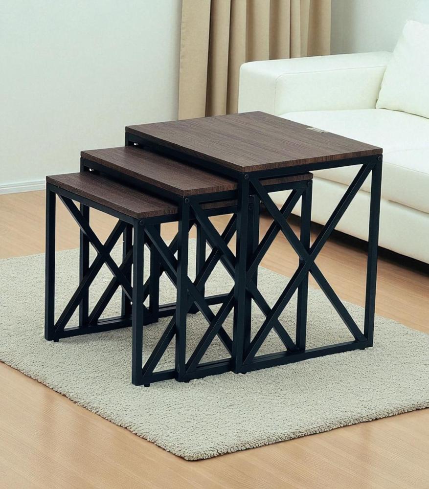 مكوّن من ثلاث قطع مصنوعة من الخشب باللون البني الغامق العصري، يتميز بتصميمه البسيط والمتناسق الذي يضيف لمسة جمالية للمكان. يمكن استخدام الطاولات معًا بشكل متكامل أو توزيعها بشكل منفصل لتلبية مختلف الاحتياجات.