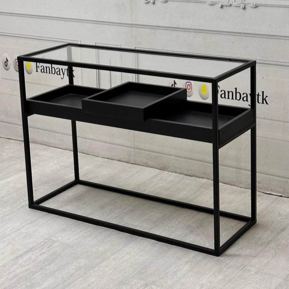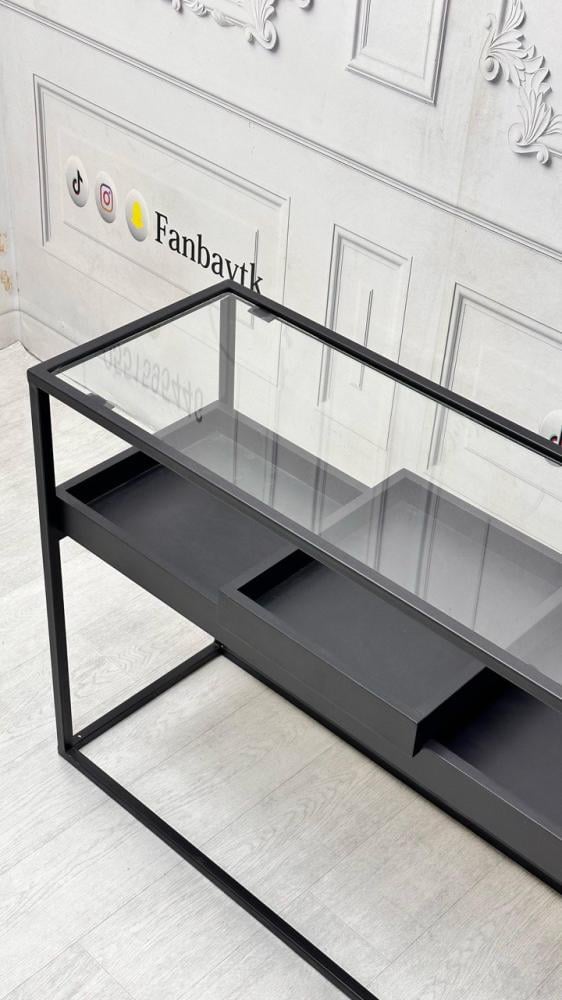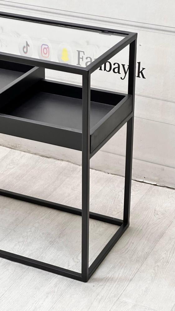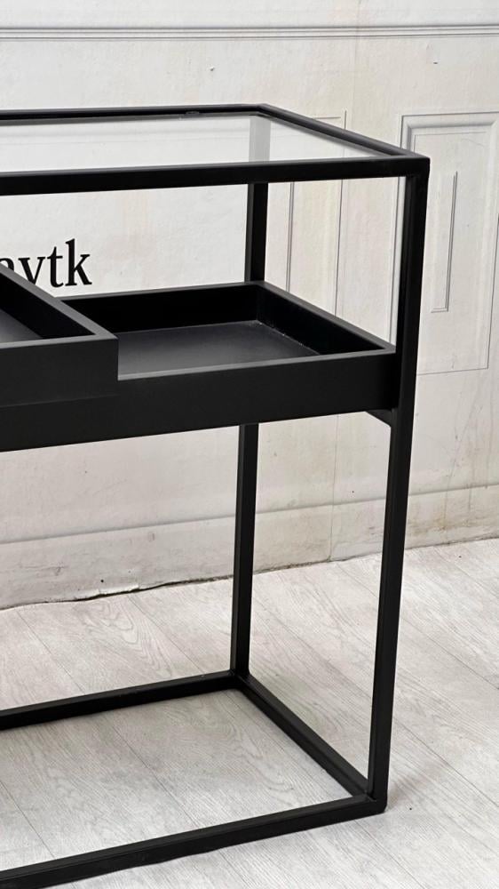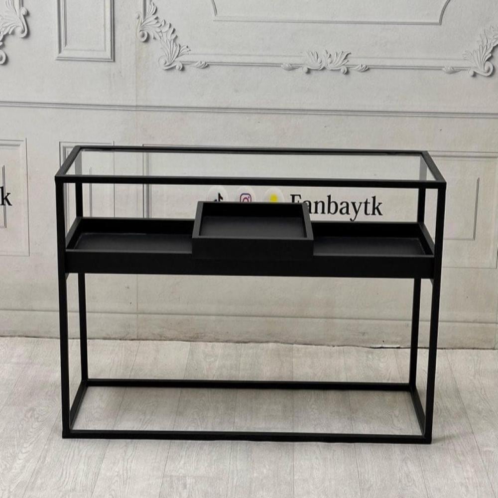 - تصميم عصري: يتميز الكونسول بإطار معدني أسود قوي يوفر الدعم والاستقرار، مع سطح زجاجي شفاف يضفي لمسة من الرقي والأناقة.