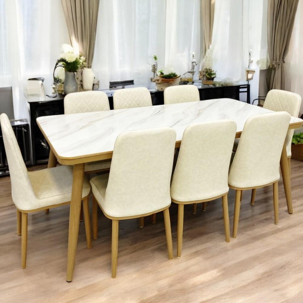- كراسي مريحة: تأتي الطاولة مع 8 كراسي أنيقة ومريحة، تتميز بتصميم عصري وأرجل معدنية.