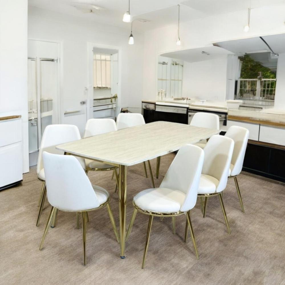 - الكراسي: لون أبيض ناصع مع إطار ذهبي.