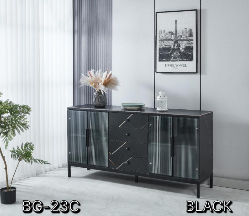 - التصميم: يتميز بتصميم مفتوح مع رفوف وأبواب، مما يوفر مساحة لعرض الأغراض وتخزينها. الأبواب مزودة بمقابض معدنية أنيقة.
