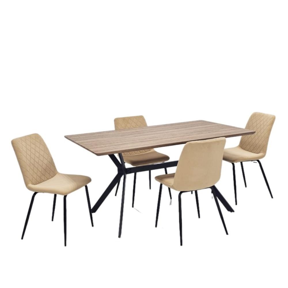 تجمع الطاولة والكراسي بين الأناقة والبساطة، مع مزيج من الخشب والمعدن والقطيفة.