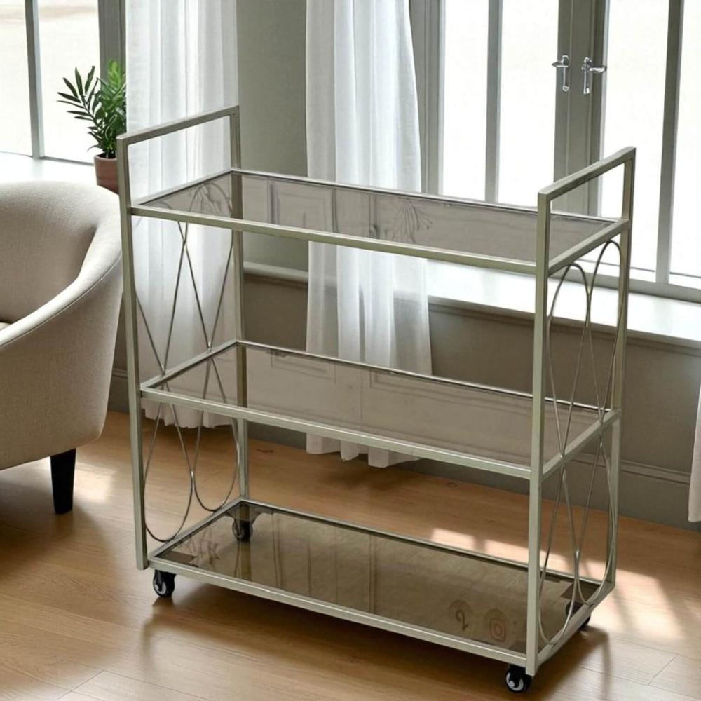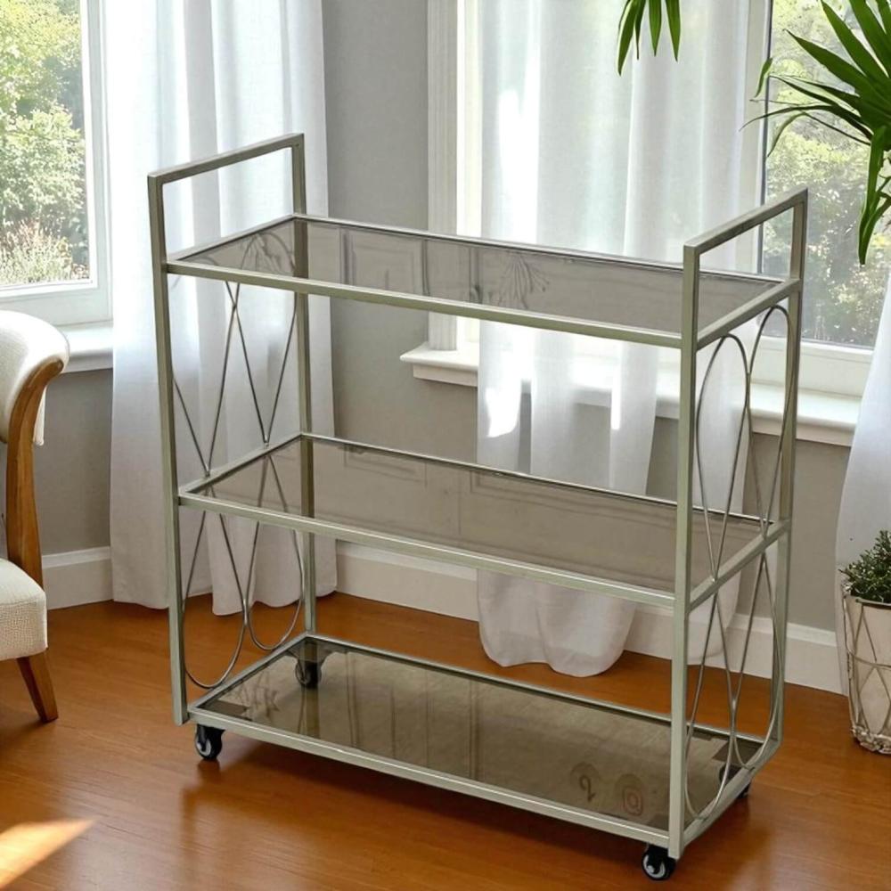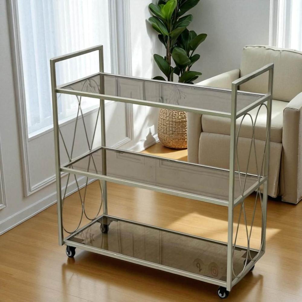 تخيل عربة ضيافة عصرية وفاخرة، مصممة لتكون إضافة عملية وجمالية لمساحتك، مثالية لتقديم المشروبات والوجبات الخفيفة بأسلوب راقٍ. تتميز هذه العربة بـ ثلاثة أدوار من الزجاج العسلي الشفاف، يضفي لمسة دافئة ومميزة، ويسمح بعرض المحتويات بشكل جذاب.