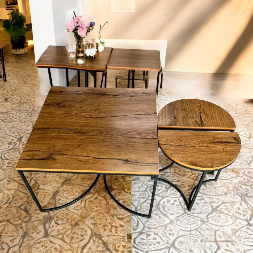 - الشكل: يتكون الطقم من ثلاث طاولات: طاولة قهوة مركزية مستطيلة الشكل وطاولتين جانبيتين على شكل نصف دائرة. هذا التصميم يوفر مرونة في الاستخدام وتنسيق الأثاث.