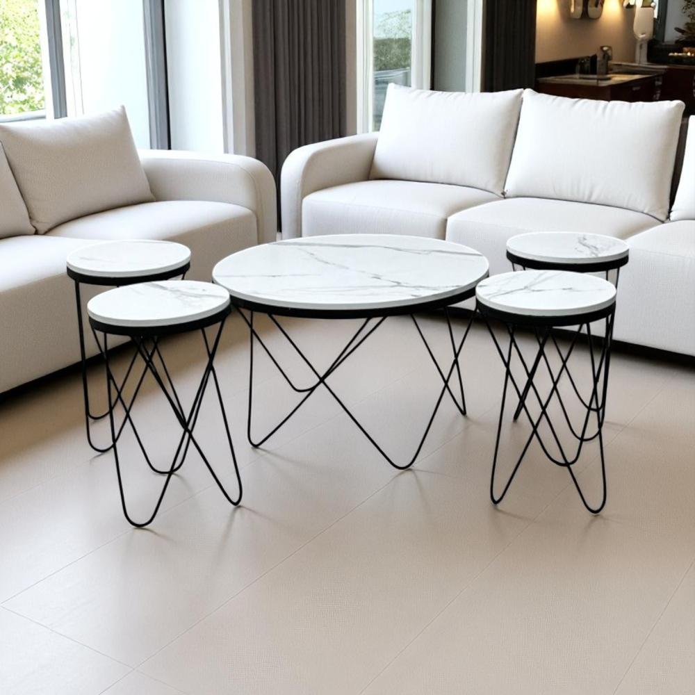 نوع المنتج : طقم طاولة لون أسود مع 4 حبات طاولات صغيرة خدمة بسطح خشب لون أبيض شبيه الرخام