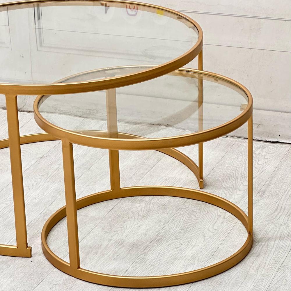هذا الطقم من الطاولات الذهبية ذات السطح الزجاجي الشفاف يمثل إضافة أنيقة وعملية لأي مساحة معيشة أو استقبال، ويعكس ذوقًا عصريًا رفيعًا.