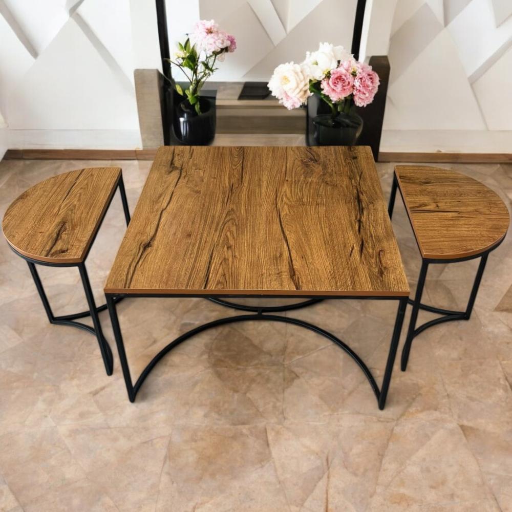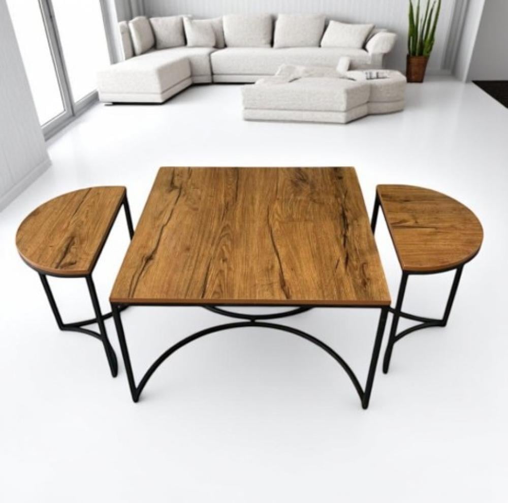 - الشكل: يتكون الطقم من ثلاث طاولات: طاولة قهوة مركزية مستطيلة الشكل وطاولتين جانبيتين على شكل نصف دائرة. هذا التصميم يوفر مرونة في الاستخدام وتنسيق الأثاث.