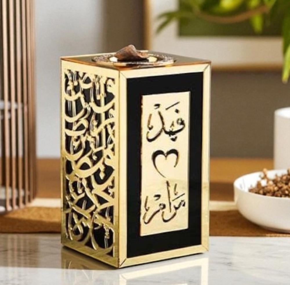 تصميم يجمع بين الأصالة والعصرية:تتميز المبخرة بتصميمها الفريد الذي يجمع بين الأكريليك الأسود اللامع، الذي يضفي عليها عمقًا وجاذبية، وبين الأكريليك الفضي أو الذهبي الأنيق، الذي يبرز جمال الخطوط العربية المنقوشة عليها. هذا التباين اللوني يخلق مظهرًا بصريًا آسرًا.
