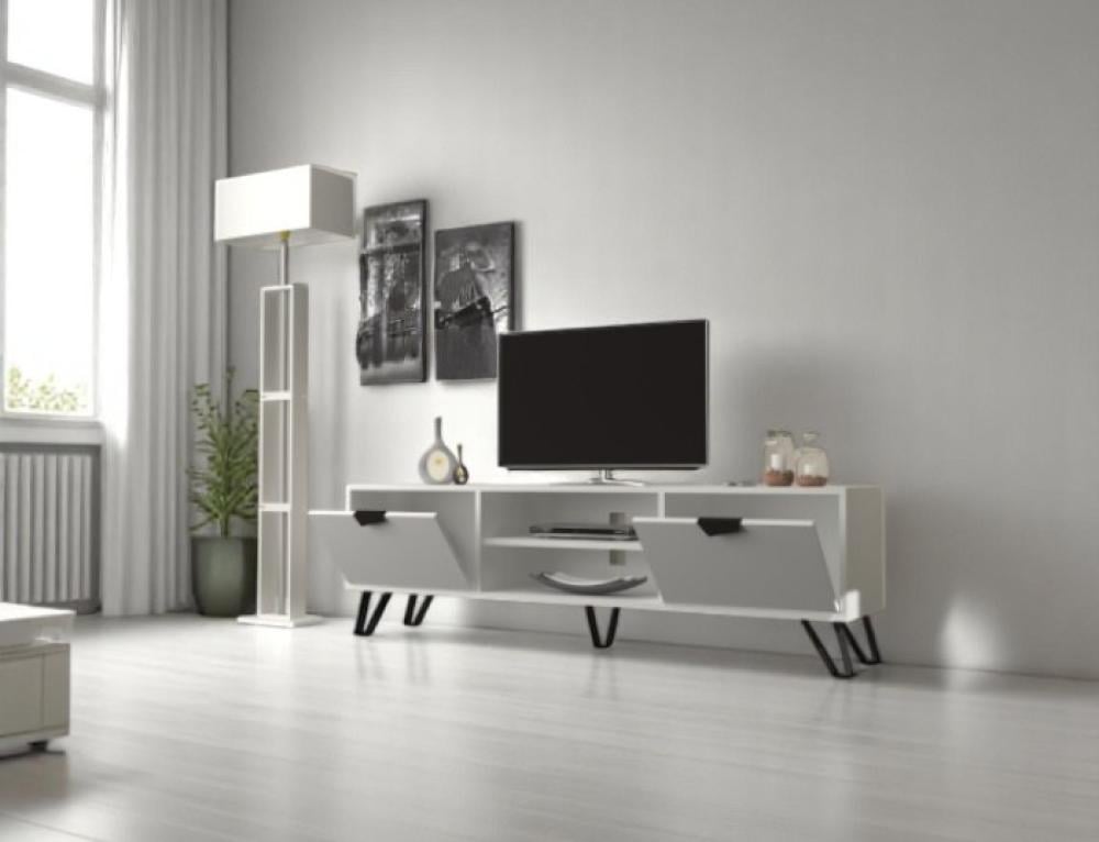 طاولة تلفزيون بتصميم مودرن أنيق تتميز باللون الأبيض لتمنح المكان لمسة عصرية وهادئة.