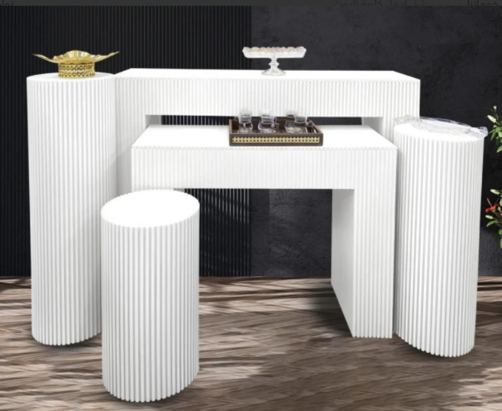 طقم طاولات واستاندات استقبال (5 قطع) بتصميم أبيض مطفي عصري وأنيق يمثل إضافة فاخرة وعملية لأي مساحة استقبال. يتميز هذا الطقم بمظهره العصري الذي يجمع بين الفخامة والبساطة، مما يجعله قطعة متعددة الاستخدامات تتناسب مع مختلف أنماط الديكور.