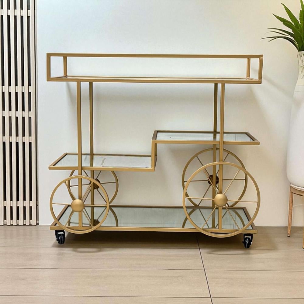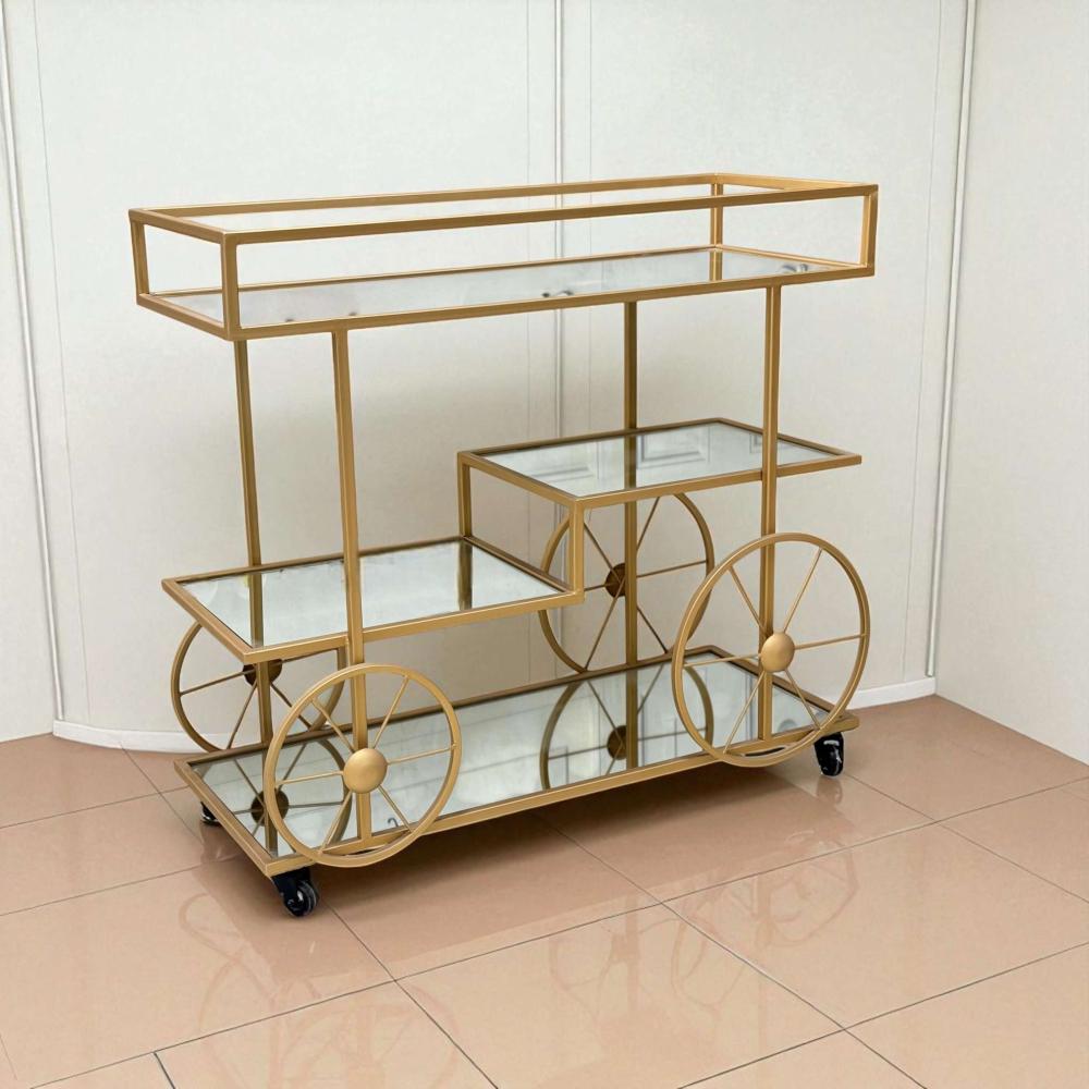 تجمع بين الفخامة والعملية، مصممة بهيكل متين من الحديد الذهبي اللامع يمنحها مظهرًا راقيًا، مع سطح زجاجي شفاف يضفي لمسة من الأناقة العصرية. مناسبة لترتيب الضيافة، تقديم المشروبات والحلويات، أو عرض القطع المميزة بأسلوب منظم وجذاب، كما أن تصميمها الانسيابي يجعلها إضافة مثالية لأي مساحة داخلية.