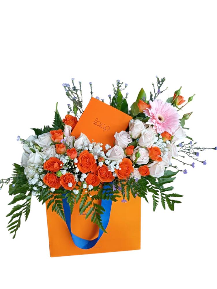 الوعاء: الباقة موضوعة في إناء زجاجي كروي الشكل، وهو تصميم عصري وأنيق. يضفي الإناء لمسة من الفخامة على الباقة ويبرز جمال الألوان الزاهية للزهور.