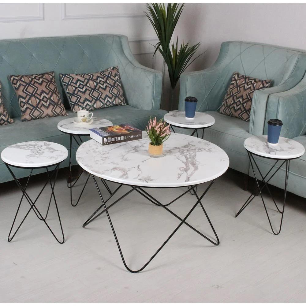 طقم طاولة لون أسود مع 4 حبات طاولات صغيرة خدمة بسطح خشب لون أبيض شبيه الرخام