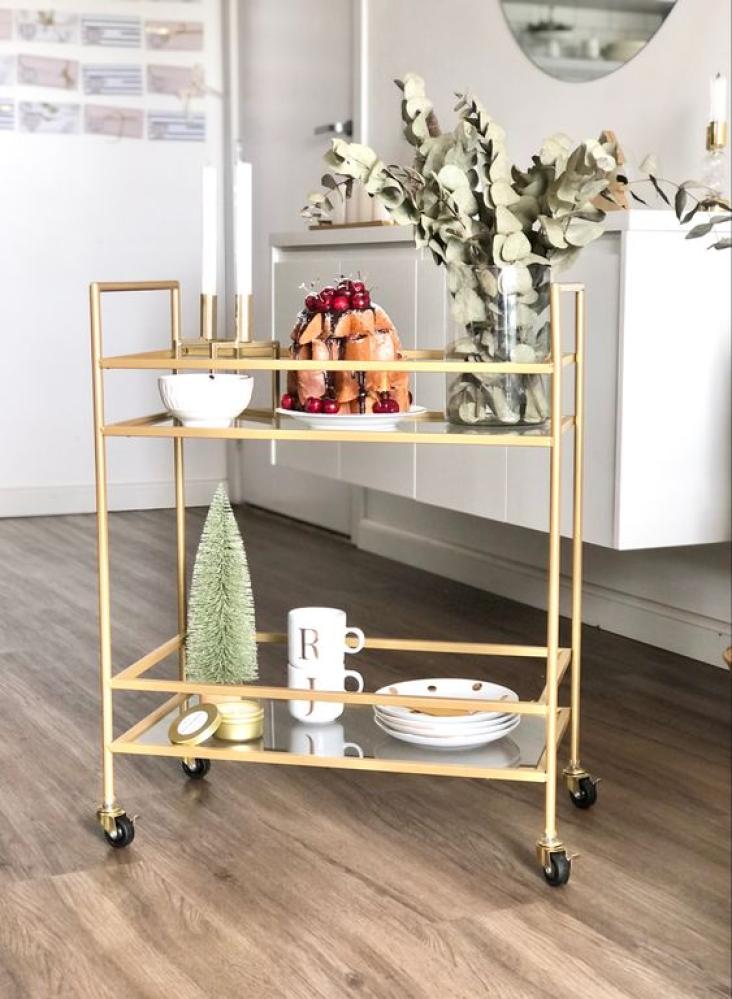 - لون ذهبي جذاب: تم طلاء هيكل العربة باللون الذهبي اللامع، مما يجعلها قطعة مركزية جذابة في أي غرفة.