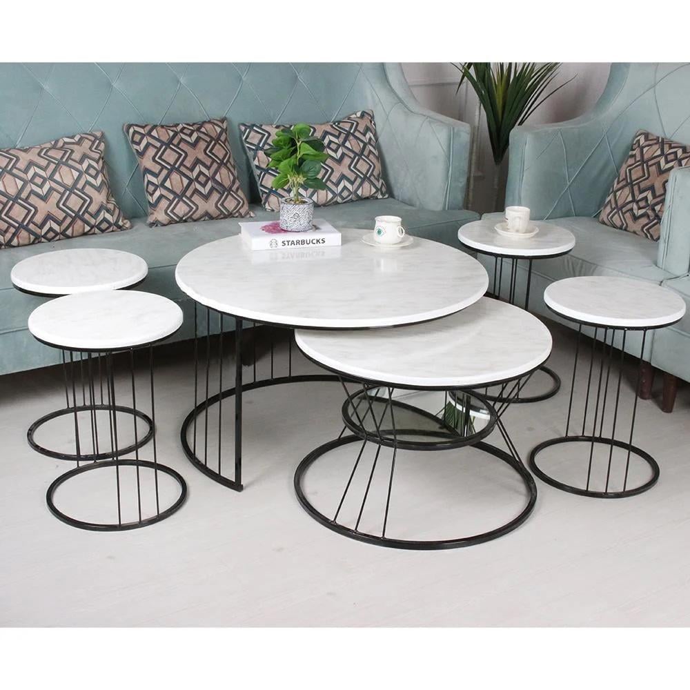 طقم طاولتين لون أسود مع 4 حبات طاولات صغيرة بسطح خشب لون أبيض شبيه الرخام + زجاج