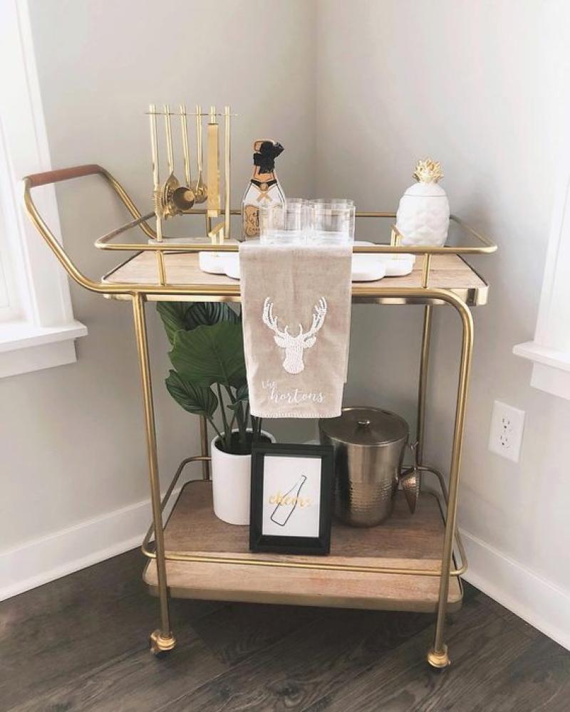 - لون ذهبي جذاب: يضفي اللون الذهبي على العربة لمسة من الفخامة والأناقة، مما يجعلها قطعة مركزية جذابة في أي غرفة.