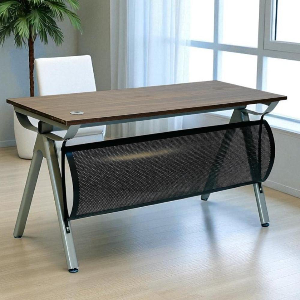 - تتميز باللون البني و يظهر في الصورة سطح الطاولة مصنوعًا من الخشب، مع أرجل معدنية.