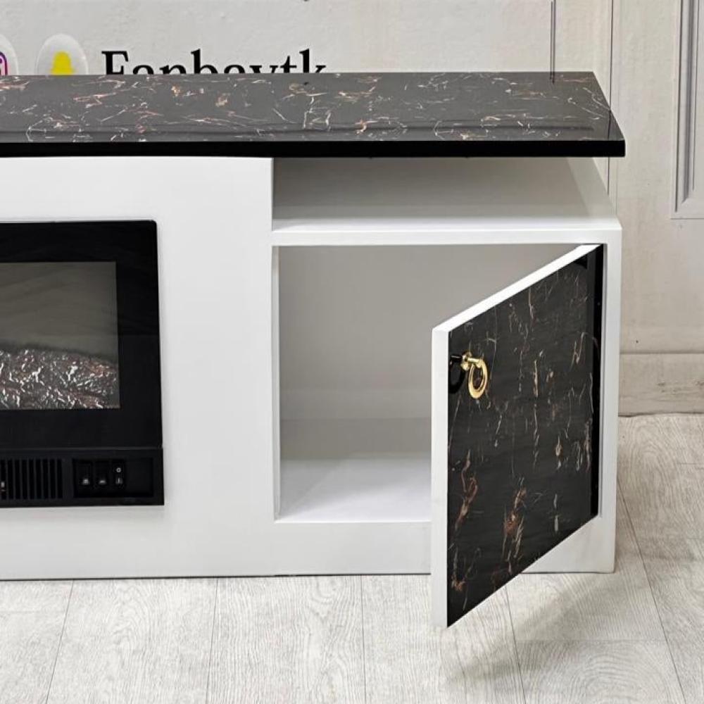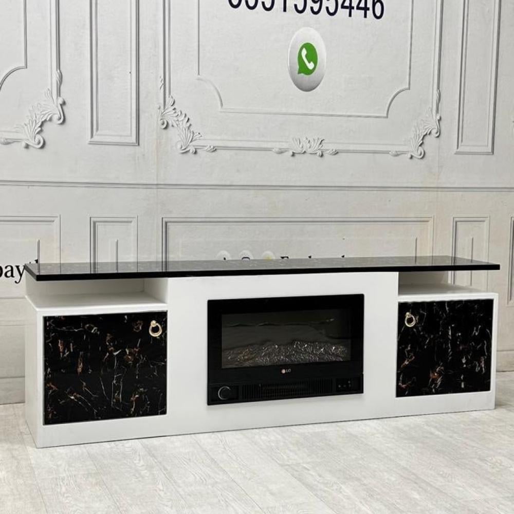 التصميم: تتميز الطاولة بتصميم بسيط وأنيق، حيث تحتوي على ثلاثة أقسام رئيسية: قسم مركزي لوضع المدفأة، وقسمان جانبيان بهما أبواب مخفية. الأبواب مزودة بمقابض ذهبية أنيقة، مما يضيف لمسة من الفخامة.