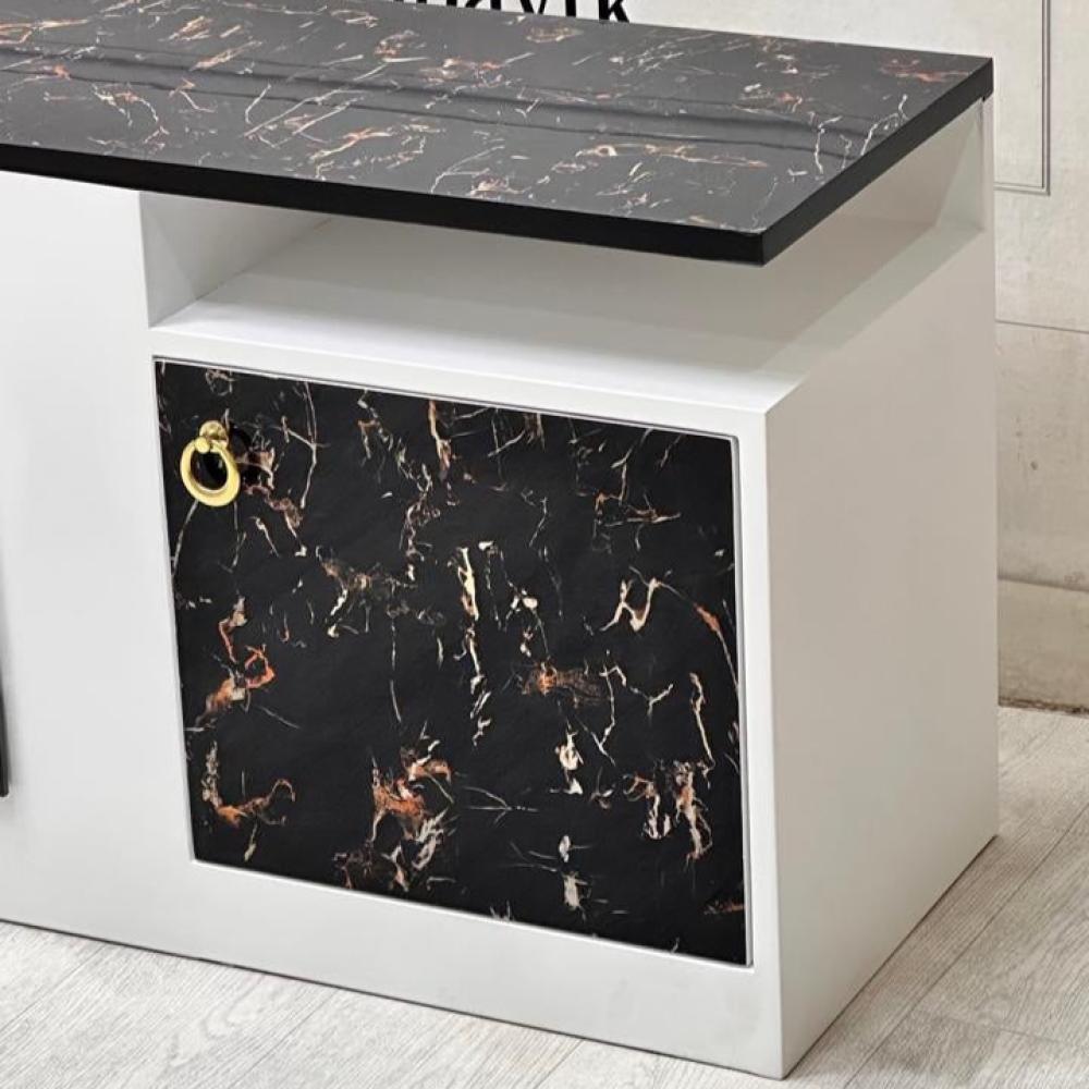 اللون: اللون الأساسي للطاولة هو الأبيض، مع لمسات من الأسود والذهبي في مادة بديل الرخام، مما يخلق تباينًا جذابًا.