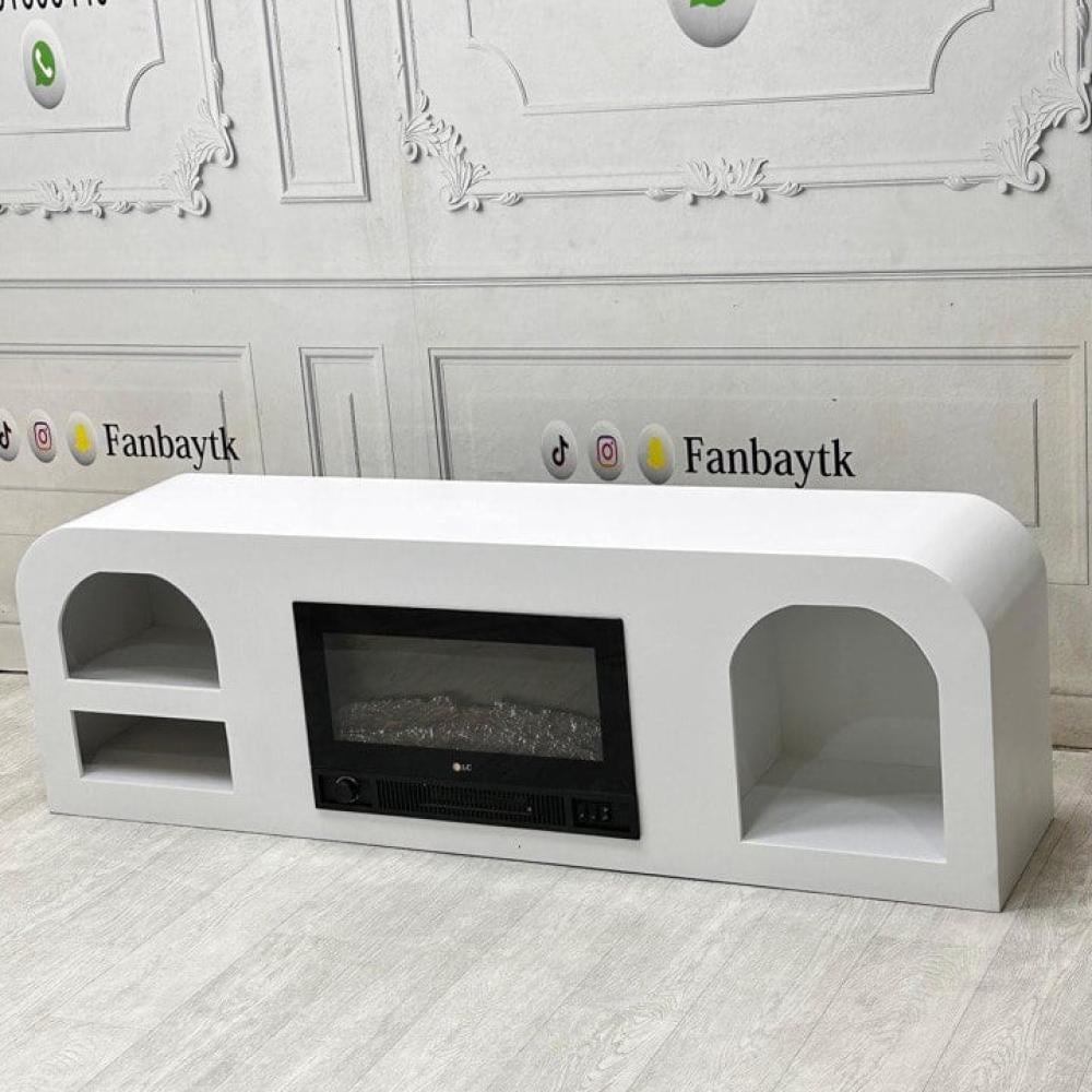 التصميم: تتميز الطاولة بتصميم بسيط وأنيق، حيث تحتوي على ثلاثة أقسام رئيسية: قسم مركزي لوضع المدفأة الكهربائية، وقسمان جانبيان بهما أرفف مفتوحة لتخزين الديكورات أو الأجهزة الصغيرة.