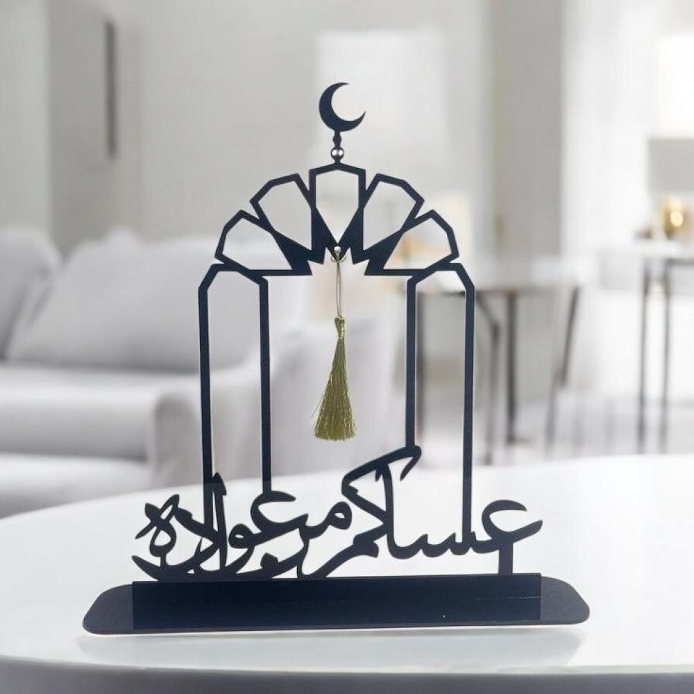 ستاند أنيق، يحمل عبارة 'عساكم من عوادة' بخط عربي جميل، مثالي لإضفاء لمسة جمالية لمنزلك
