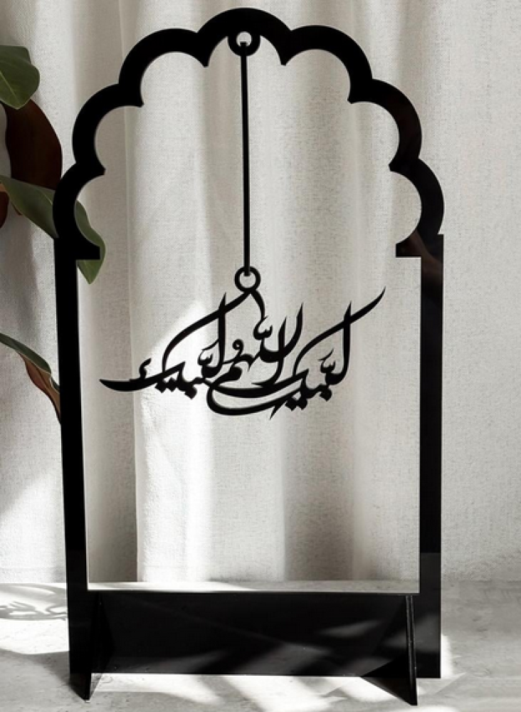 مقاس الستاند ٢٦×٤٥ سنتيمتر، مقاس عبارة لبيك اللهم لبيك ١٩٫٤×١٠٫٦ سنتيمتر. مصنوع من أكريليك أسود ويتميز بتصميم منقوش بأعلى جودة بالليزر مستوحى من روح عيد الأضحى المبارك. تصميمه الأنيق يجعله مثاليًا لتزيين الرفوف أو الطاولات في المنزل أو المكتب، كما أنه هدية رائعة للأهل والأصدقاء. الأكريليك مزود بملصق حماية يجب إزالته قبل الاستخدام.