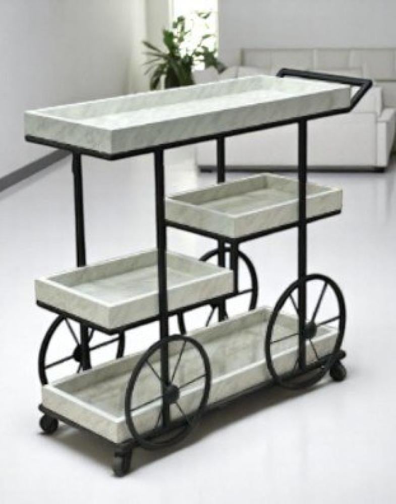 تتميز الأرفف الأربعة بأنها مصنوعة من الخشب باللون الأبيض الناصع، الذي يضفي لمسة من الإشراق والنظافة على التصميم. يتناقض هذا اللون الأبيض بجمال مع الهيكل المعدني باللون الأسود، الذي يحيط بالأرفف ويمنح العربة مظهرًا عصريًا ومتينًا. هذا التباين اللوني لا يضيف فقط جاذبية بصرية، بل يضمن أيضًا استقرار ومتانة العربة.