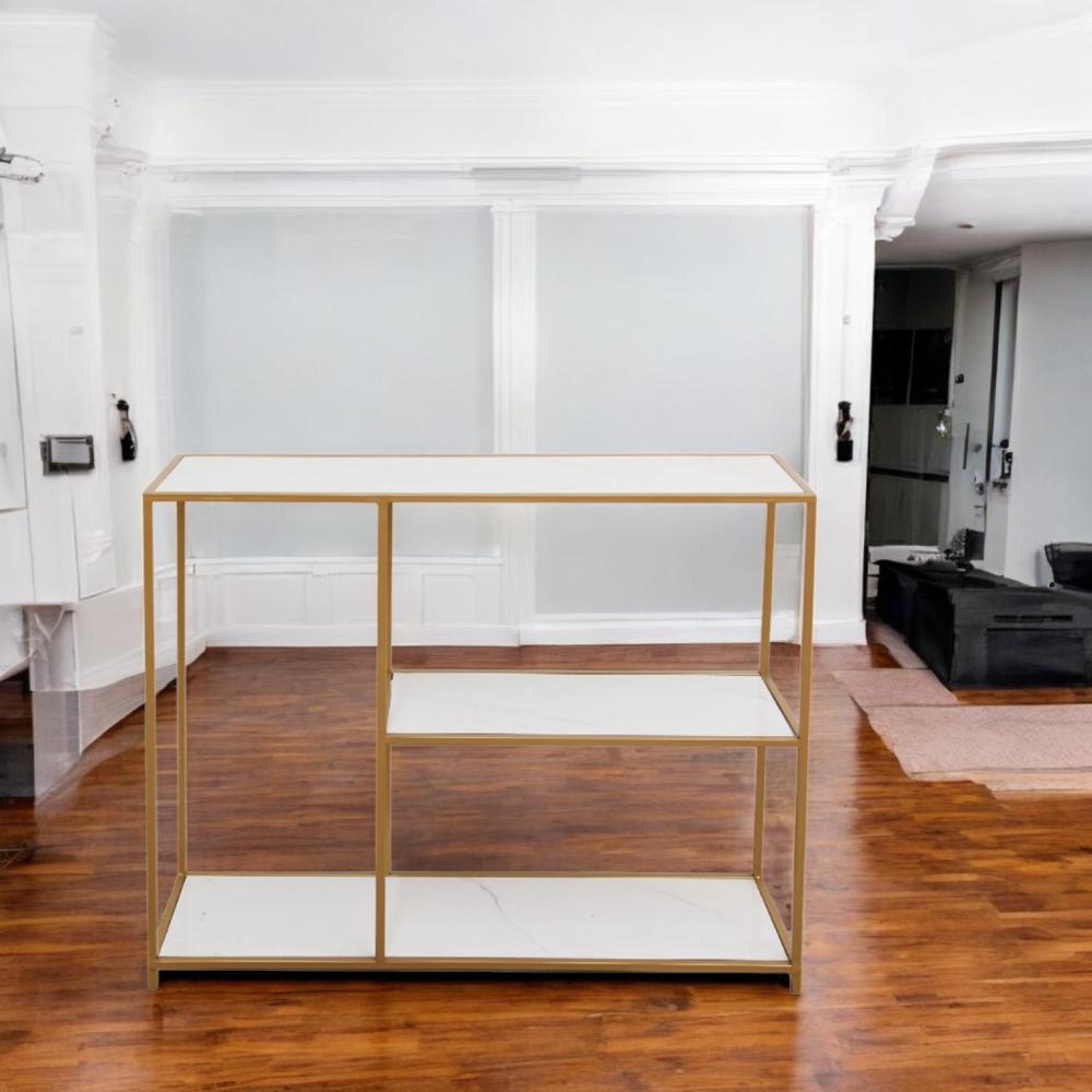 يتميز هذا المدخل بتصميم عصري يجمع بين البساطة والأناقة. يتميز بإطار خارجي مصنوع من الحديد المطاوع باللون الذهبي، مما يضفي عليه مظهرًا فاخرًا وعصريًا. بينما يأتي السطحان العلوي والوسطي والسفلي مصنوعين من البورسلين الأبيض، مما يضفي لمسة من الفخامة والأناقة.