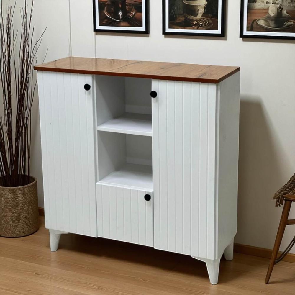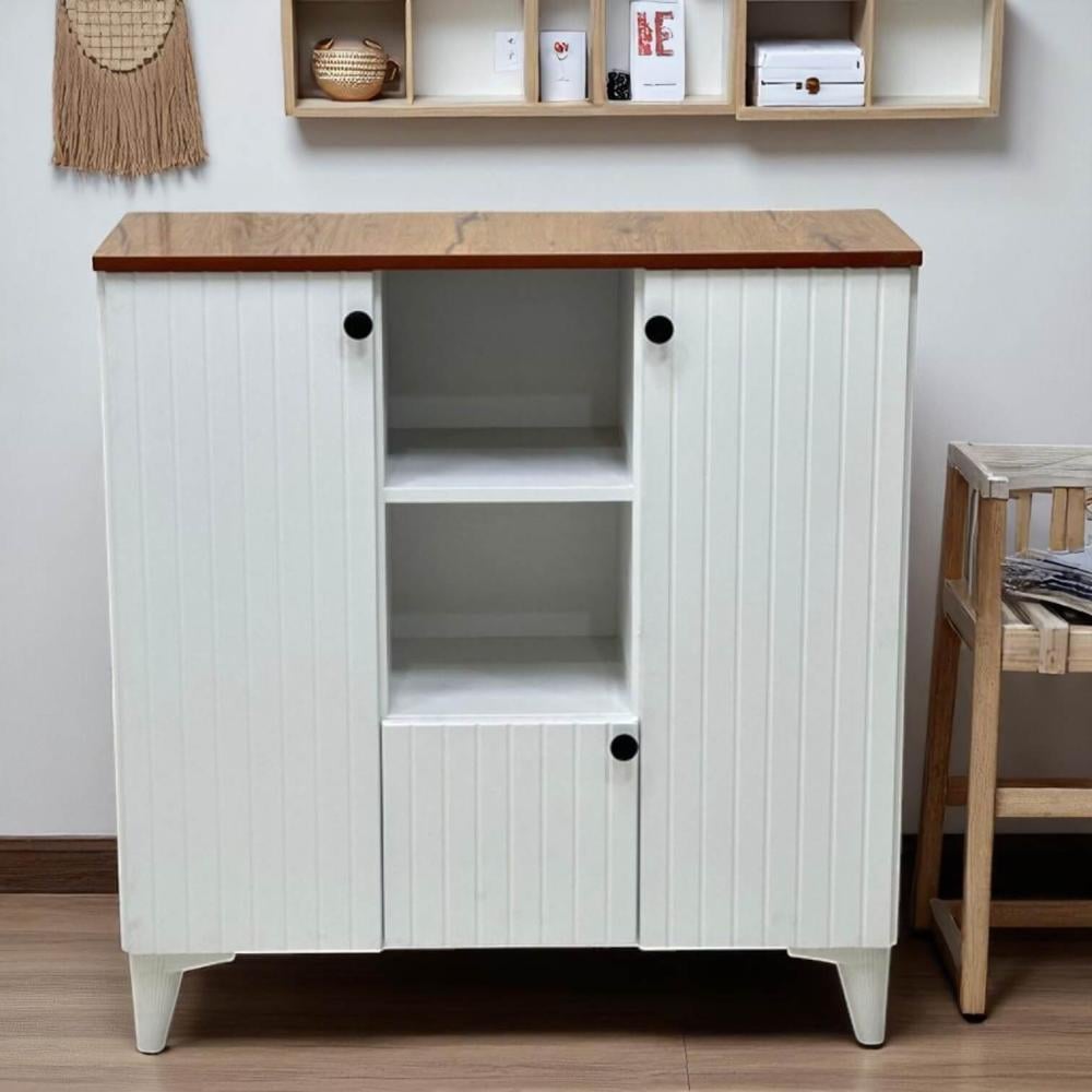 3 أدراج سحب بمقابض سوداء: توفر هذه الأدراج مساحة تخزين مغلقة وعملية للحفاظ على الأغراض بعيدًا عن الأنظار، مثل أدوات التنظيف الخاصة بماكينة القهوة، أو المناديل، أو أي مستلزمات أخرى. المقابض السوداء الرفيعة تضيف لمسة عصرية وأنيقة تبرز اللون الأبيض وتكمل التصميم العام.