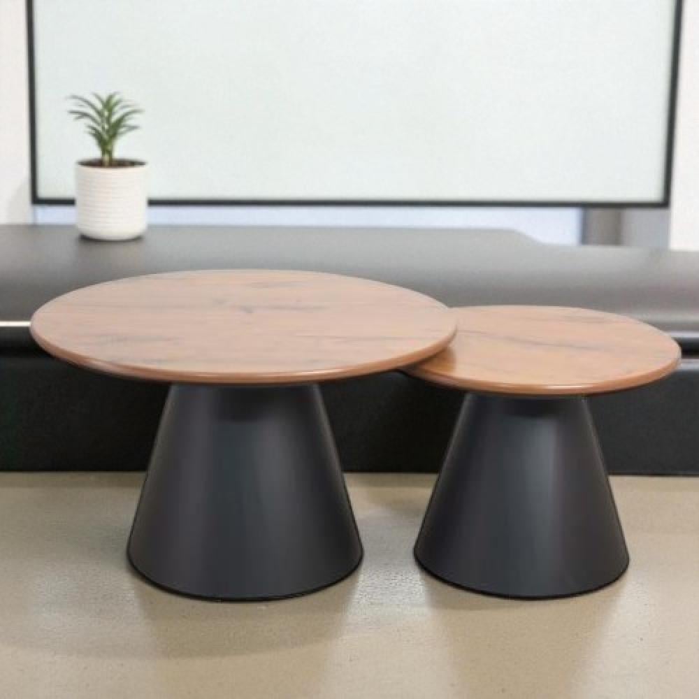طاولات بتصميم دائري عصري وأنيق تُضفي لمسة جمالية على ديكور منزلك.سطح الطاولات مصنوع من الخشب بلون بني راقي وسهل التنظيف.قاعدة معدنية متينة باللون الأسود تُوفر الدعم والثبات.