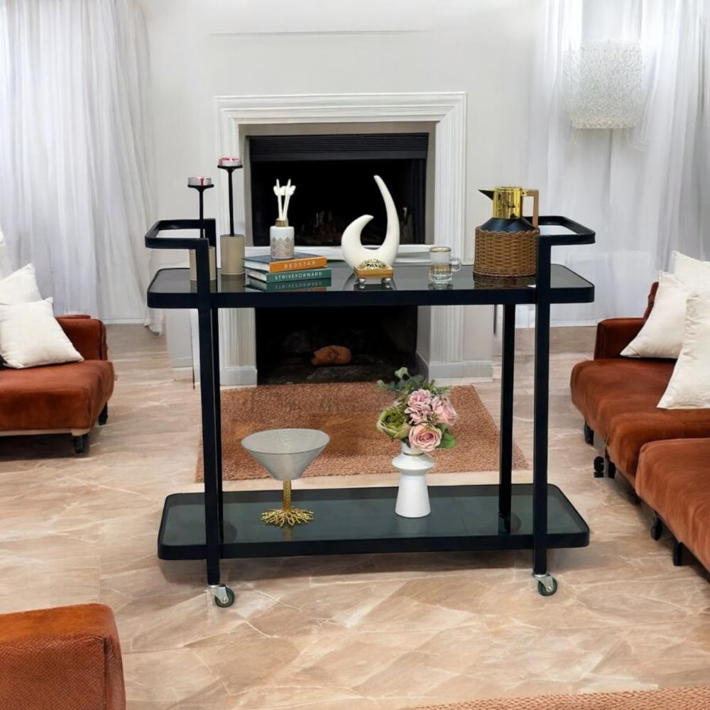 عربية تقديم دورين بلون أسود وبسطح زجاجي أسود