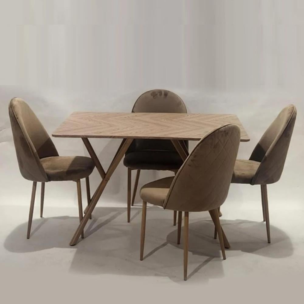 يتكون من طاولة سفرة تأخذ الشكل المستطيل والمصنوعة من الخشب الطبيعي بأرجل قوية من المعدن و6 كراسي انيقين من المخمل مزودة بمسند للظهر ويساعد على الراحة والاسترخاء أثناء الجلوس